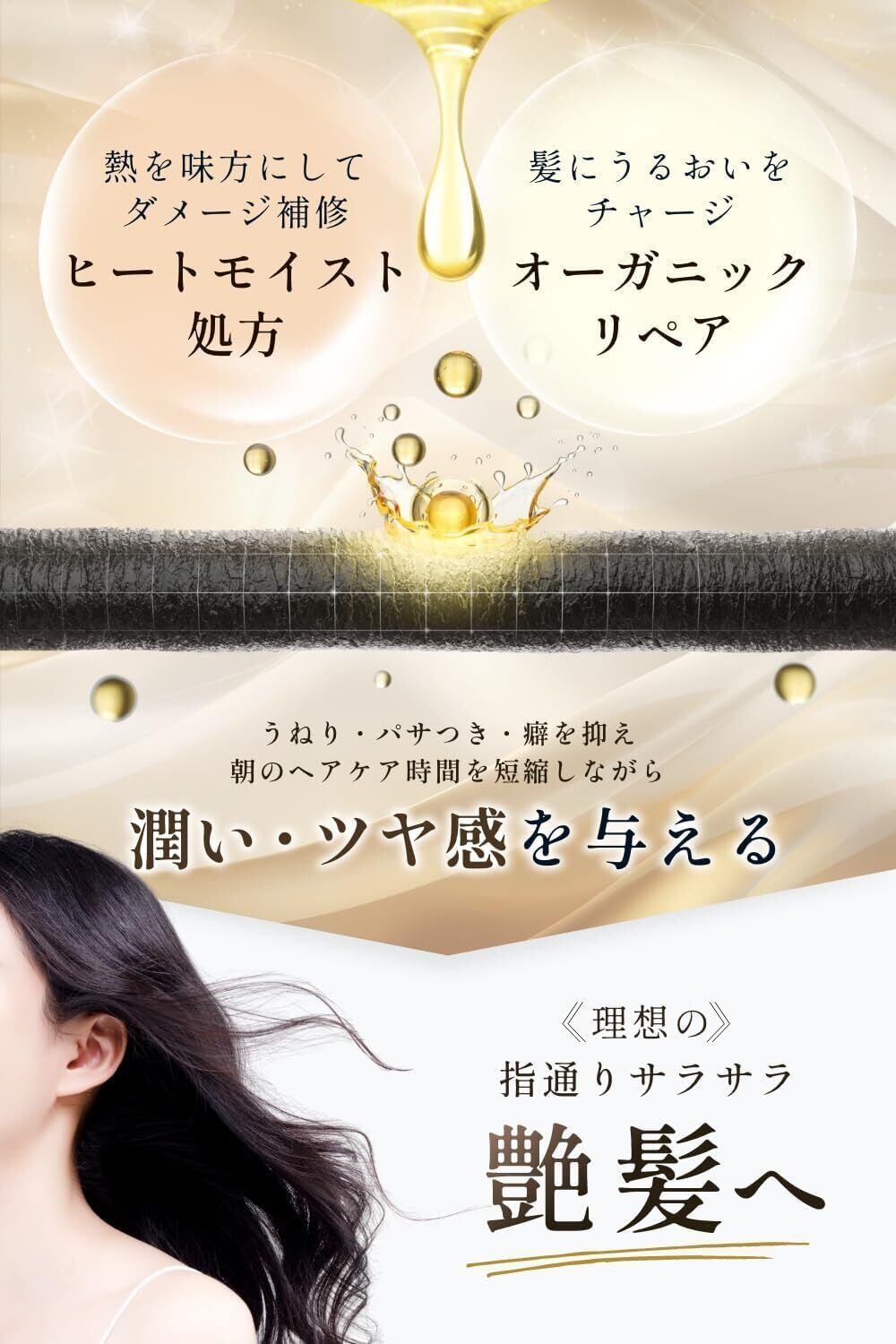 商品特長 【保湿・補修・速乾のトリプルケア処方】髪の芯に潤いを与えるオーガニック認証成分6種、キューティクル補修効果・速乾作用のあるカシミアコートを採用。