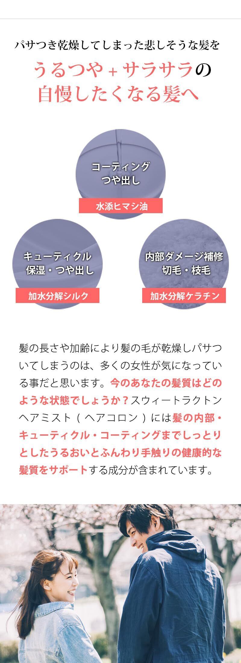 【特別な場面からデイリー使いまでおすすめ!】「スウィートラクトン ヘアミスト」は、普段使いはもちろん、特別なイベントやデートシーンにも最適です。自分へのご褒美や、友人や家族へのプレゼントにもおすすめです。この機会にぜひお試しください!