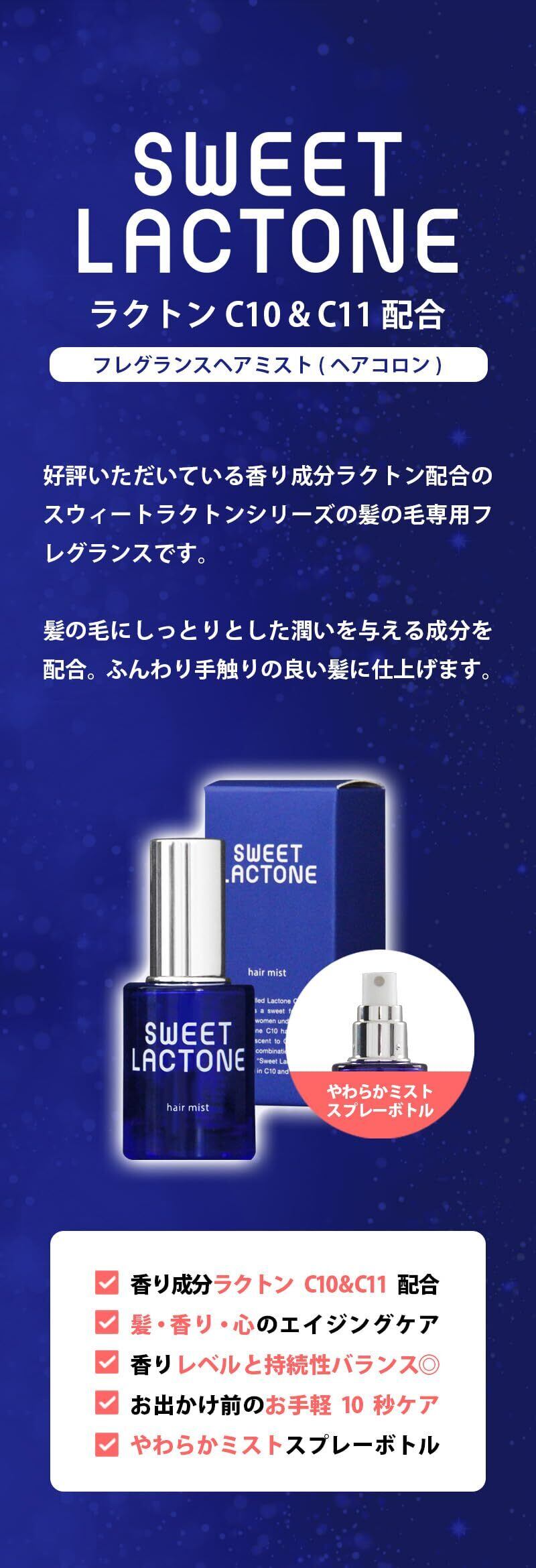 【ラクトンC10&C11配合 ヘアミスト(ヘアコロン) 香りの濃度と持続性のバランス◎】スウィートラクトン ヘアミスト(ヘアコロン)は、好評をいただいております香り成分ラクトン配合のスウィートラクトンシリーズの髪の毛専用フレグランスです。髪の毛にしっとりとした潤いを与える成分を配合。ふんわり手触りの良い髪に仕上げます。