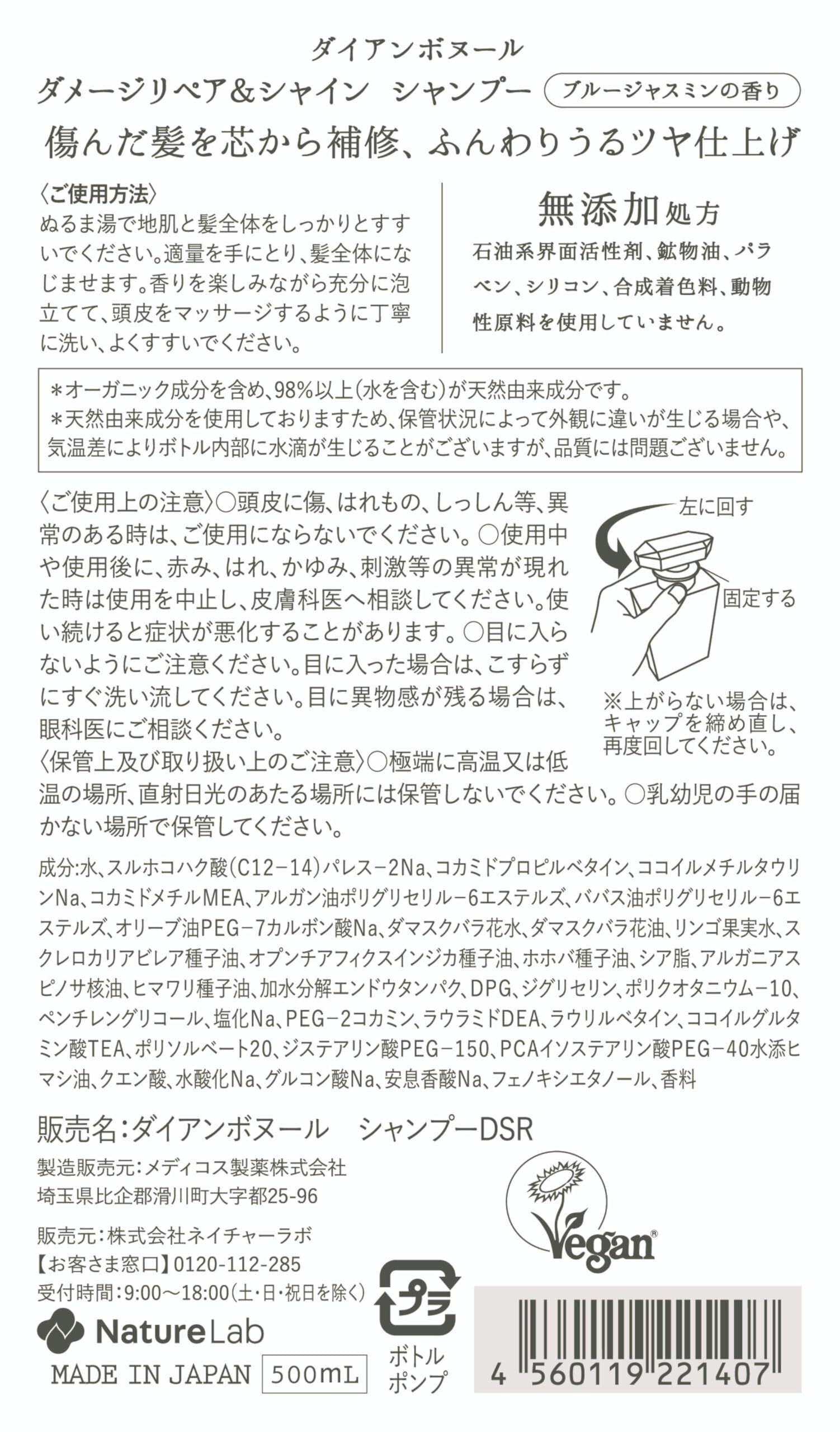 【美しい輝きを求めるあなたに!】Diane Bonheurのシャンプーは、優雅なブルージャスミンの香りに包まれながら、髪に必要な栄養をしっかりと届けます。日常的なケアで、ダメージから髪を守り、美しいツヤやかさを生み出す特別なシャンプーです。