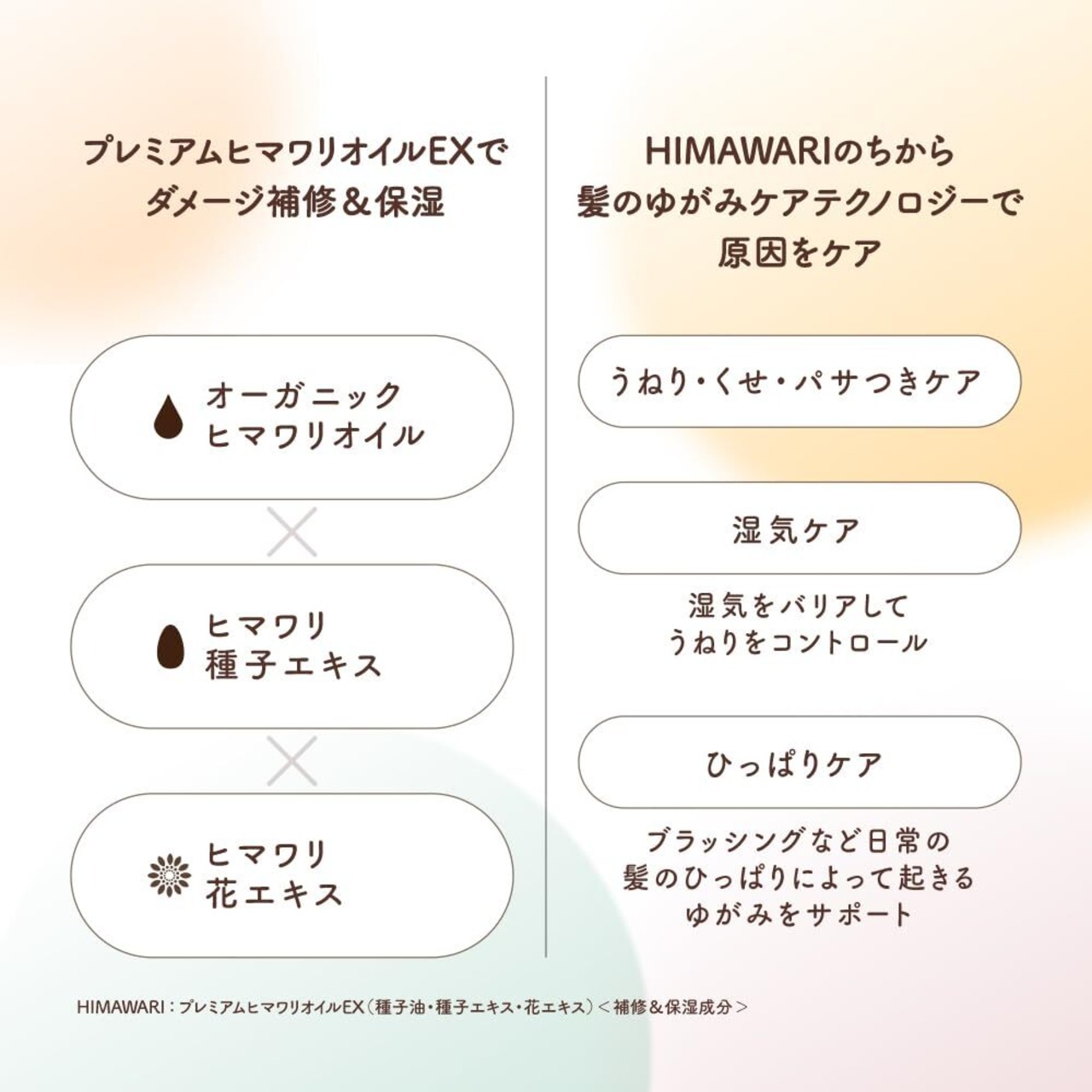 ●広がり抑制処方●プレミアムヒマワリオイルEXで髪内部にうるおいをあたえ、髪の外側のキューティクルのはがれをコート●髪ゆがみケアテクノロジーでうねり・くせ・パサつきケア&湿気ケア&ひっぱりケアで髪の内部&外側を全方位でケア