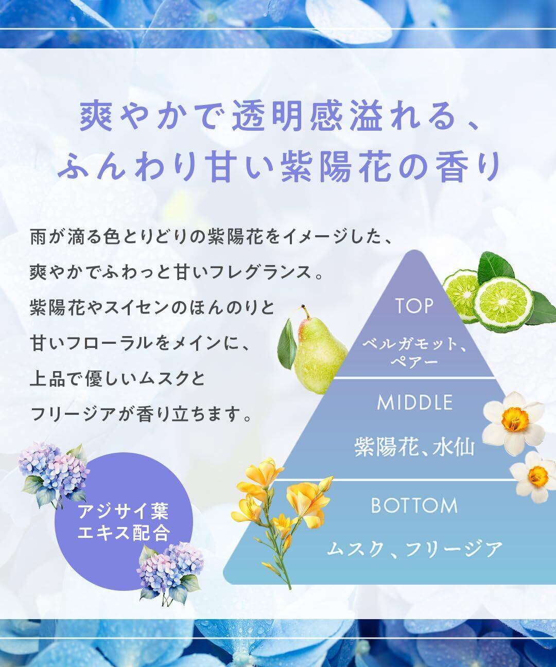 香りへのこだわり:雨が滴る紫陽花をイメージした、爽やかでふわっと甘い「アジサイの香り」。紫陽花やスイセンのほんのりと甘いフローラルをメインに、上品で優しいムスクとフリージアが香り立ちます。湿気で少し憂鬱な気分もリフレッシュさせてくれるような香りです。