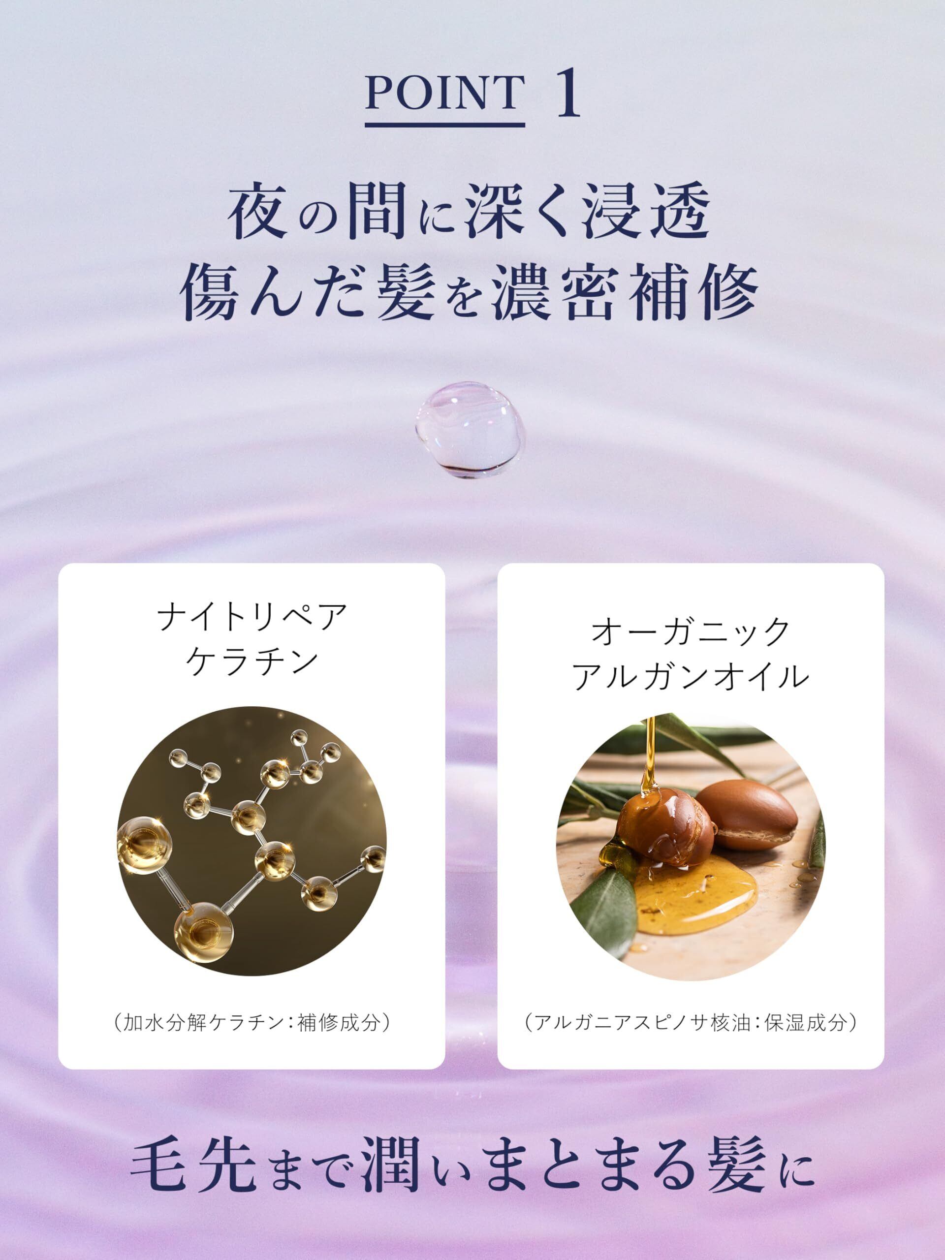 寝ている間に深く浸透しダメージ補修。毛先までうるおう髪へ。