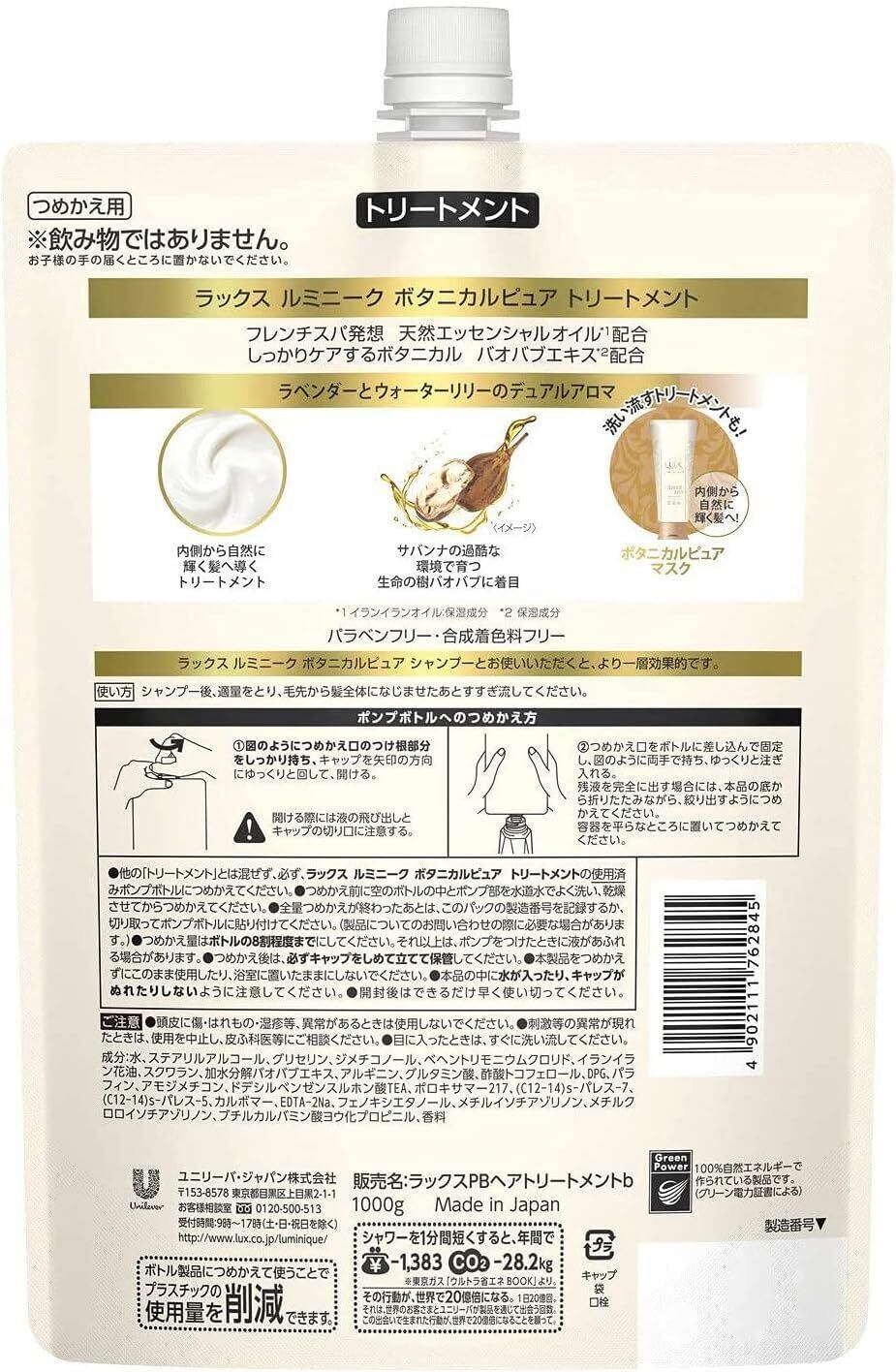 «特徴» ●サバンナの過酷な環境で育つ、生命の樹といわれるバオバブエキス(※1)を配合。 ●フレンチスパ発想。100%天然のエッセンシャルオイル(※2)配合。 ●しっかりケアするボタニカルで、内側から自然に輝く髪へ。 ●夜と朝で香りが変わる。ラベンダーとウォーターリリーのデュアルアロマ。 ●パラベンフリー、合成着色料フリー。 ●売上No1(※3)ブランドからノンシリコン(※4)。 «商品説明» サバンナの過酷な環境で育つ、生命の樹といわれるバオバブエキス(※1)を配合。フレンチスパ発想。100%天然のエッセンシャルオイル(※2)配合。しっかりケアするボタニカルで、内側から自然に輝く髪へ。夜と朝で香りが変わる。ラベンダーとウォーターリリーのデュアルアロマ。パラベンフリー、合成着色料フリー。売上No1(※3)ブランドからノンシリコン(※4)。ラックス ルミニーク ボタニカルピュア シャンプーとお使いいただくと、より一層効果的です。 ※1…保湿成分 ※2…イランイランオイル(保湿成分) ※3…INTAGE SRI シャンプー、コンディショナー市場 2018年5月~2019年4月金額シェア ※4…シャンプーのみ