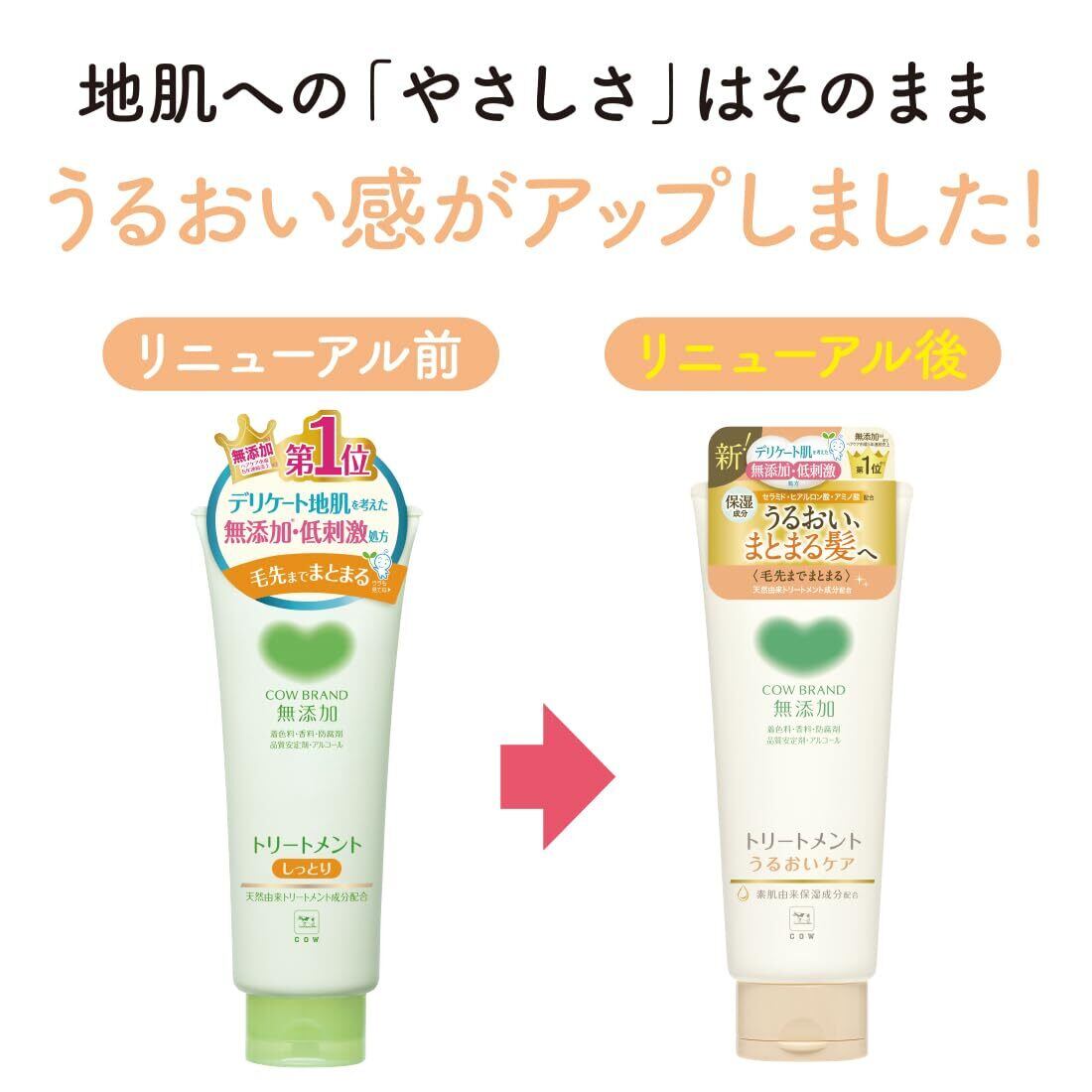 【敏感肌に優しい無添加トリートメント】カウブランドの無添加トリートメントは、肌に優しい成分を使った特別な処方で、デリケートな髪にも安心して使用できるアイテムです。毎日のヘアケアで、しっとりとしたうるおいを与え、パサつきのないツヤのある髪へと導きます。