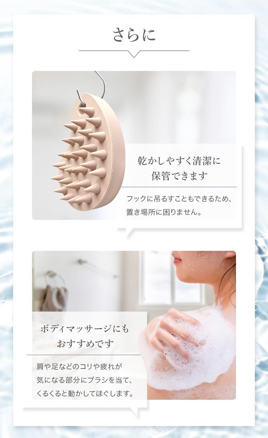 【頭皮のリフレッシュ】シャンプー時に使用すると、極細の突起が毛根の余分な皮脂や汚れをしっかり洗い上げます。洗浄力の強すぎるシャンプーはさけ、肌質に合ったシャンプーを使いましょう。頭皮環境をケアし、バスタイムを至福の空間へ。