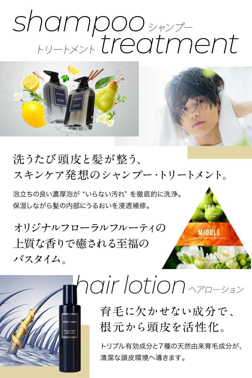 【まるで香水のようなスカルプシャンプー&トリートメント】1日中いい匂いが続くフレグランスシャンプー&トリートメント。 新鮮なラフランスとグリーンアップルのジューシーで水々しい香りとフリージア・ムスク・ウッド・レモン・ローズ・ジャスミン・アンバー・パチョリ・スズランの香りを1%レベルで調合したEVERSKINオリジナル フローラルフルーティの香りをお楽しみください。