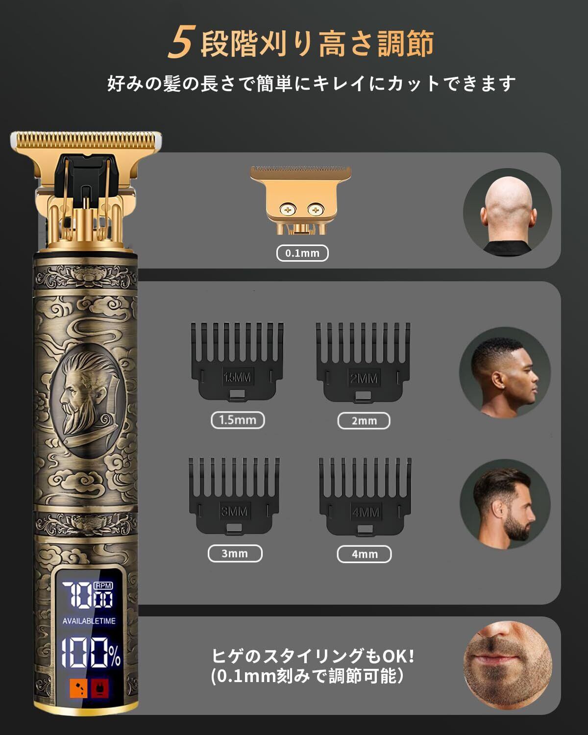 【レリーフパターンデザイン&切れ味抜群&安全性】バリカンはスタイリッシュな外観と高品質のブレードを備えています。ヘアカッター全体が精巧に彫られ、細部に至るまで細心の注意を払ってパターンが作られ、デザインがかっこいいです。カッターヘッドはR型取り刃設計を採用しており、優れた切断性能、髪の毛を絡まない優れた切れ味と滑らかさ、安全で迅速なトリミング、そして肌を傷つけません。簡単・安全な設計で初心者でもご心配なく使えます。簡単に好みの髪の長さ、もみあげにカットできます。