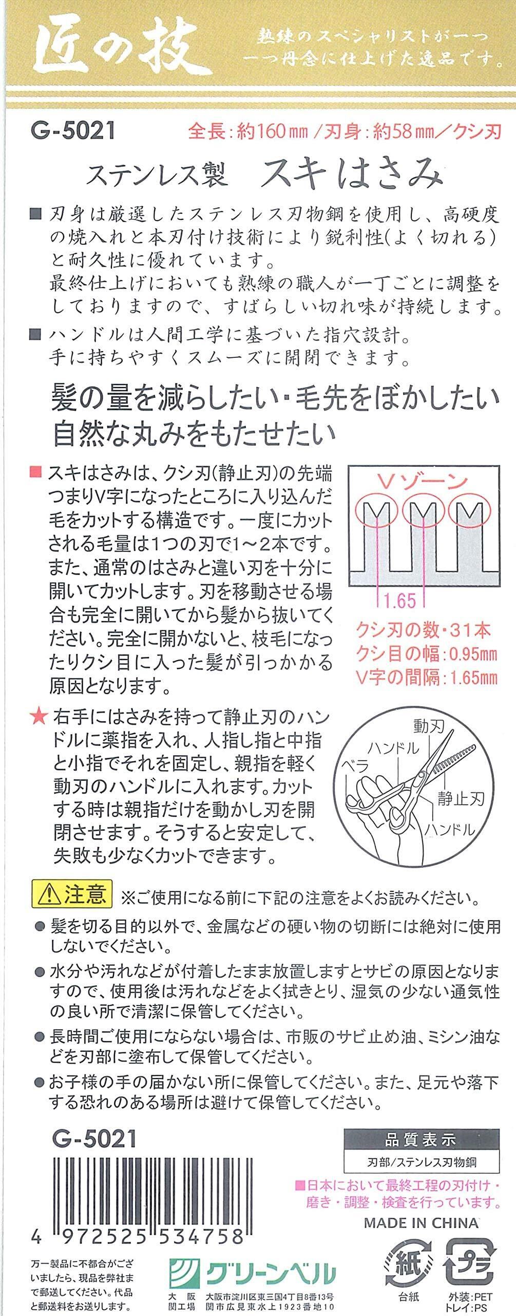 匠の技が光る「G-5021」は、髪の量をしっかり調整できる高品質なスキばさみです。自宅でのセルフカットや、お子様の毛量調整に最適。初心者からプロの方まで、安心してお使いいただけるアイテムです。