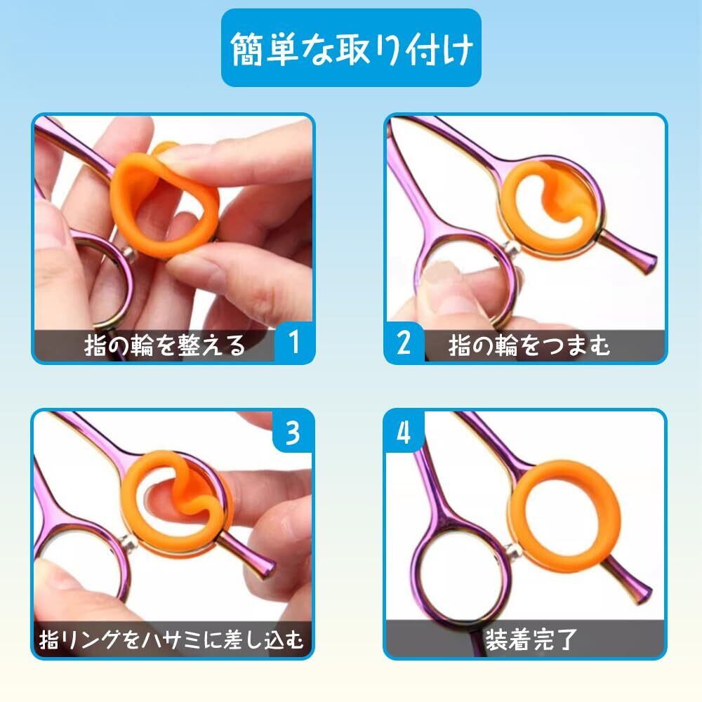 このシザーリングは、理美容師や自宅でのスタイリングに最適なアイテムです。シリコン製で柔らかく、指にしっかりフィットする設計になっており、指の疲れを軽減しながら安心してハサミを扱うことができます。