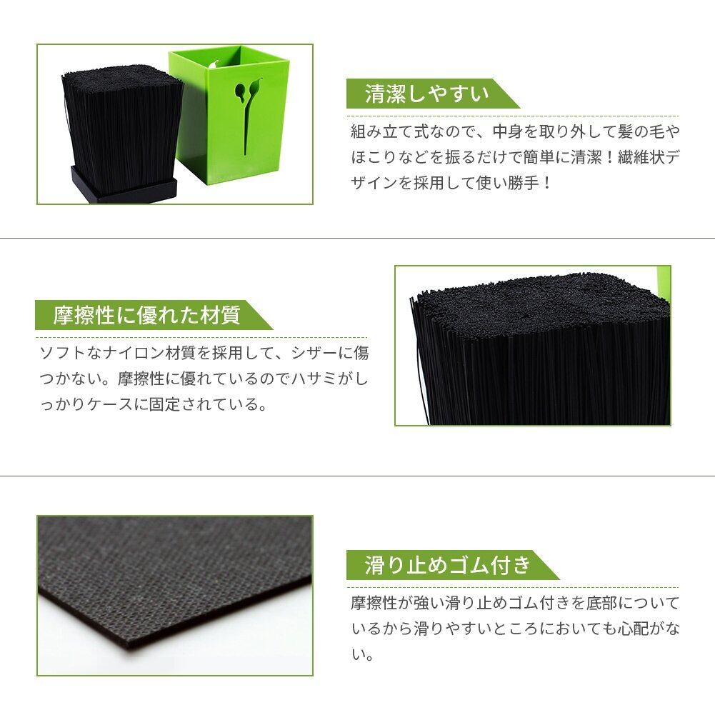 【清潔しやすいデザインを採用する】このハサミ立ては取り外せるデザインで清潔しやすいです。内部は髪などのゴミを清潔したい時に取り外して振るだけで簡単に清潔できます。中身は繊維状で固定された場所がなくそのまま刺して簡単に整理できます。