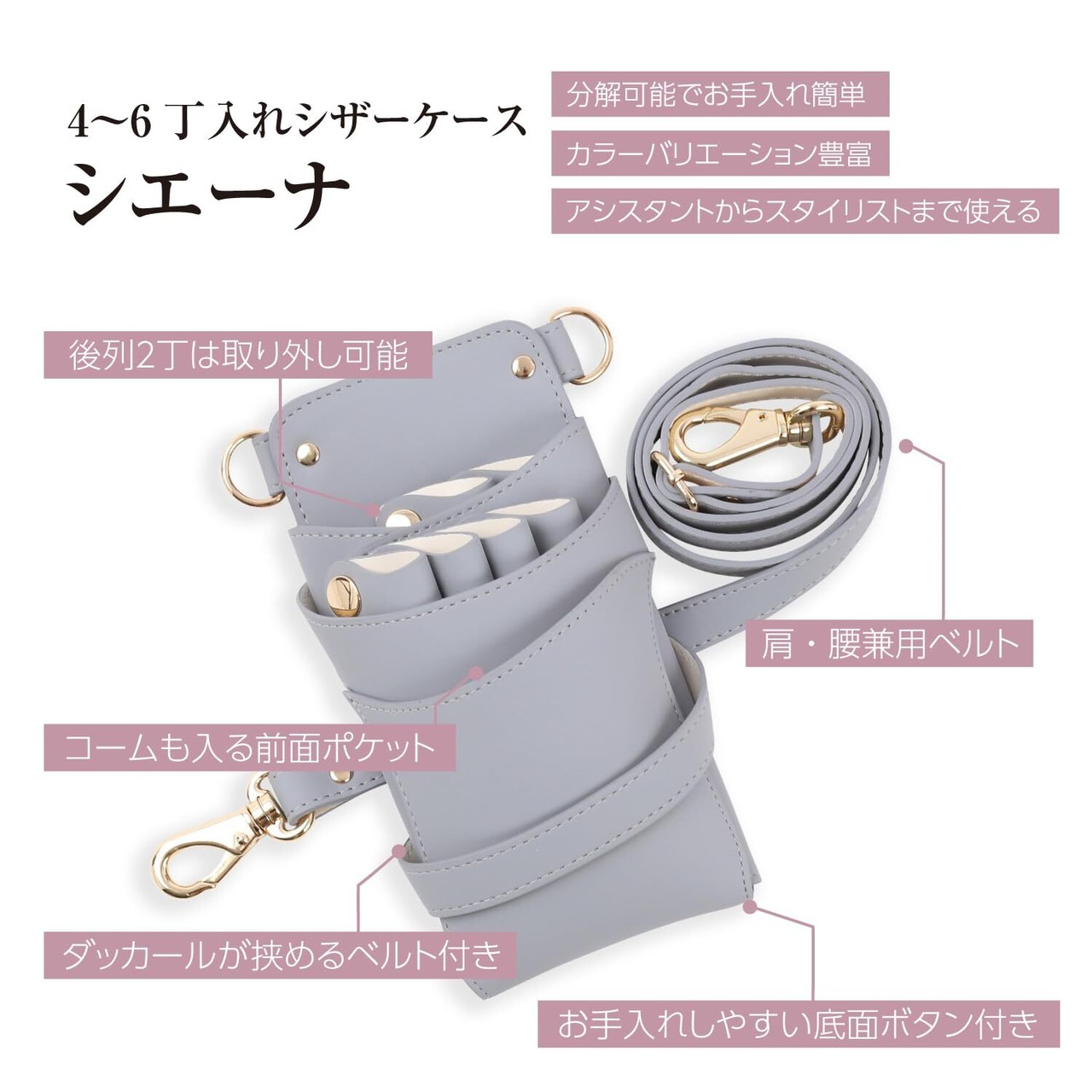 マットな風合いのあるPUレザーを使用した6丁入れのシザーホルダーがついたコストパフォーマンスの高いシザーケースです。 後列のシザーホルダー2丁はそれぞれ取り外しが可能なので、用途やお好みに合わせてお使いいただけます。 スリムなデザインにこだわりつつ、ブラシやダッカールなどを挟むベルトやコームや小物を収納できるポケットなど機能性ももちろん重視しました。 また、底面がボタン式になっている他、各パーツが取り外せるので、日々のお手入れや掃除も簡単です。 専用ベルトは、腰巻きはもちろん肩掛けとしてもご利用いただけます。