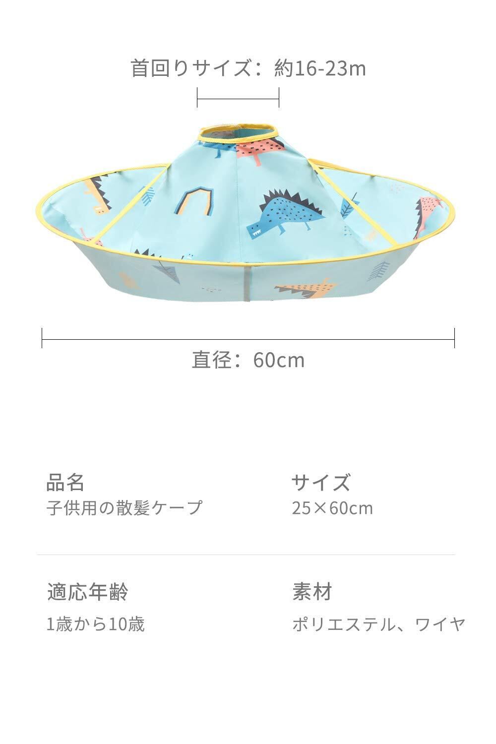 この散髪ケープは、お子様も喜ぶ青い恐竜デザインで、お家でのヘアカットを一層楽しめます。防水素材を使用しているため、髪の毛や毛染めによる汚れをしっかりと防ぎます。家庭でのセルフカットやお子様の散髪に最適なアイテムです。