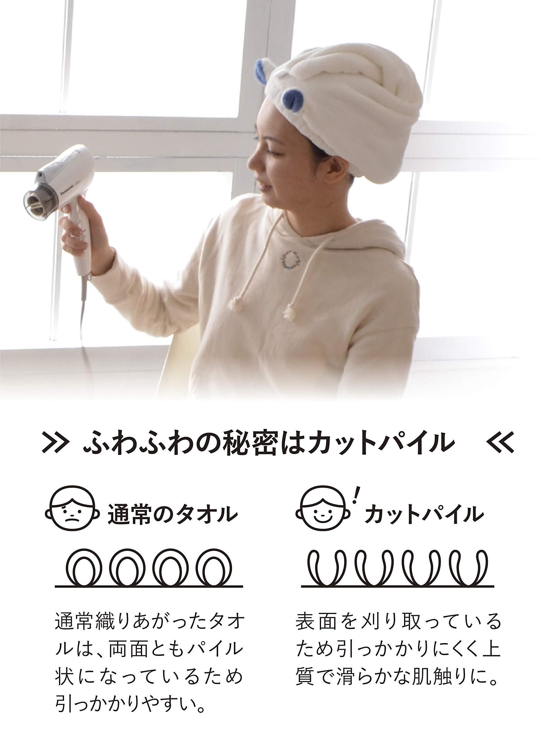 かぶるだけで髪の毛の水分をサッと吸水し、ドライヤーの時間短縮に